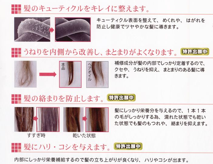 失われていく脂質分を徐々に補っていきます。1回で沢山つけるのではなく何度も何度も繰り返し使うことで髪を蘇らせます。毛髪の組織構成に極めて似ているため非常に親和性が高く、髪にしっかり吸着し傷んで剥がれているキューティクルを整えます。